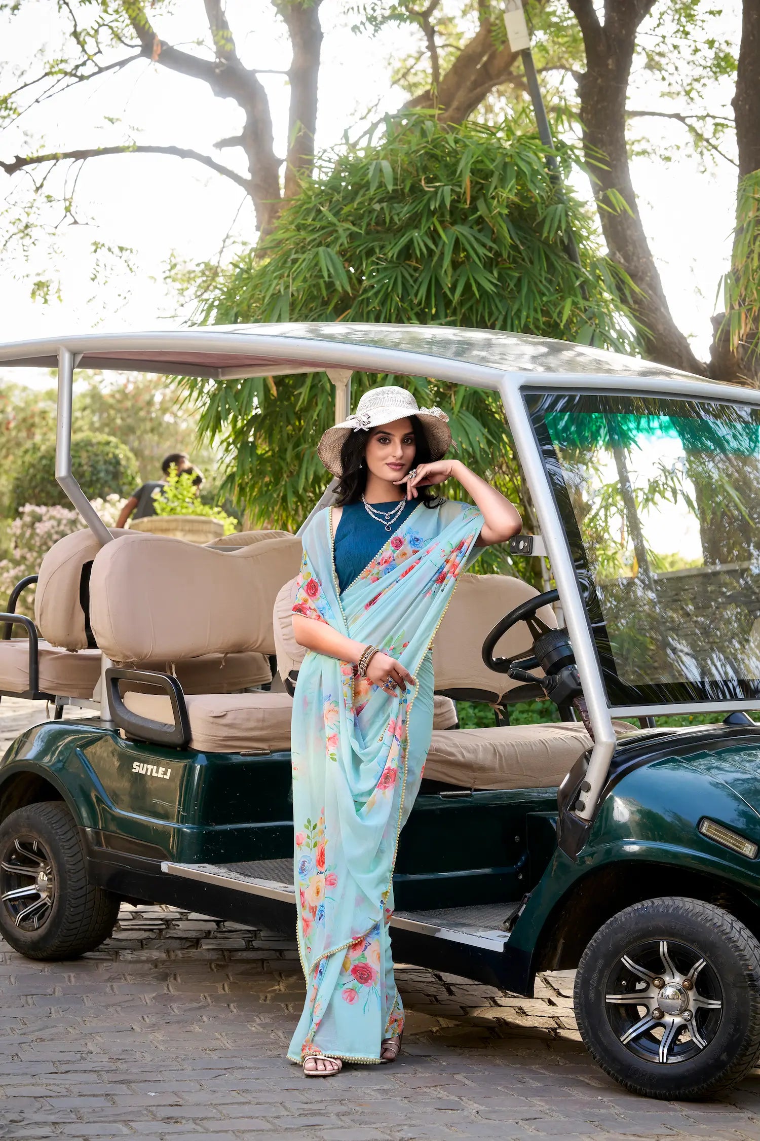 Sea Blue Weightless Marbal Saree With Floral Print & Lace Border