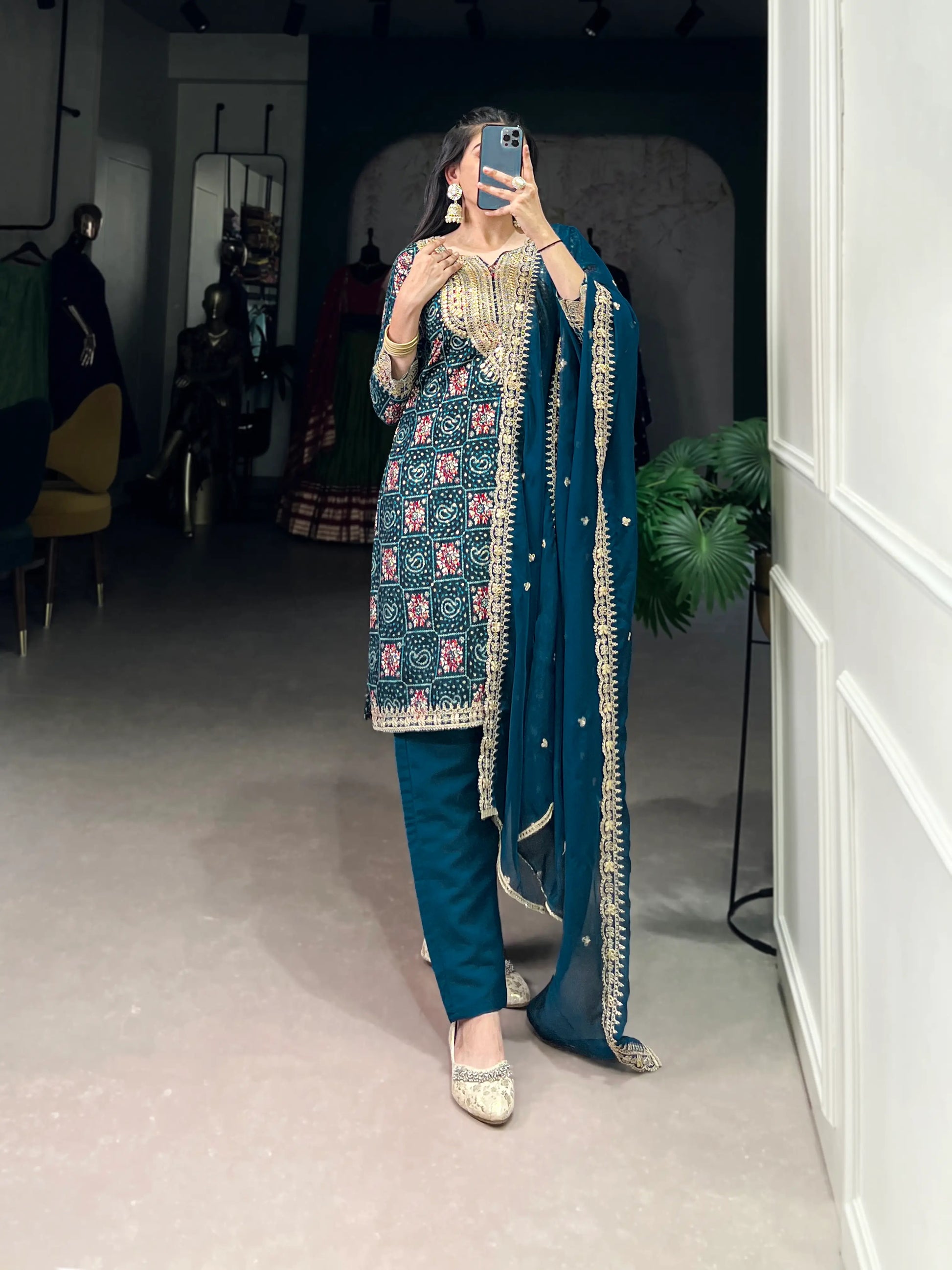 Yellow Chinon Palazzo Salwar Suit With Thread & Sequins Embroidery Work