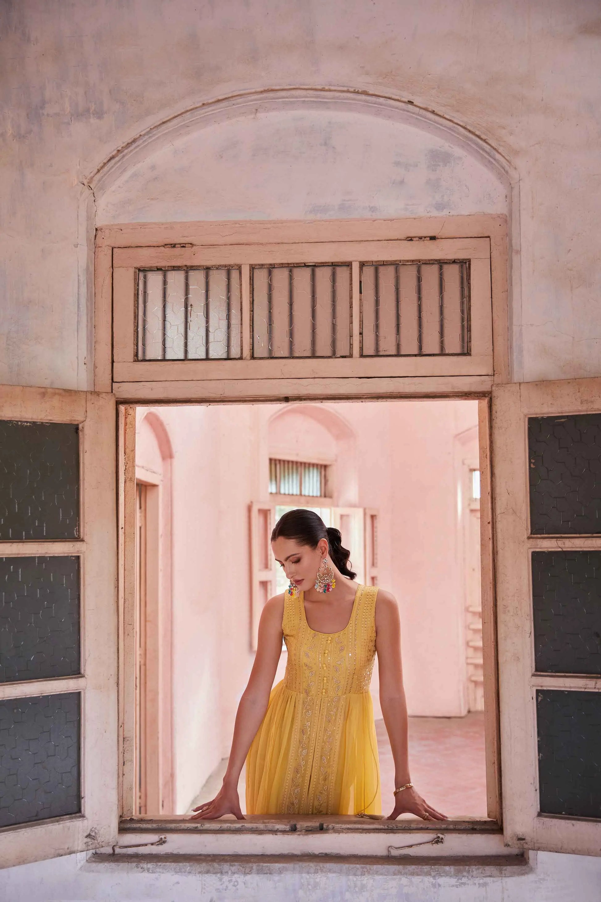 Yellow Embellished With Thread Sequins Embroidery Work Indo Western With Dupatta